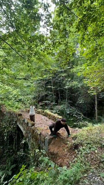 Hemşin‘de ressam Serdar Abay ve kızı Behice Betül Abay, tatile geldikleri köylerinde ırmak üzerinde yaklaşık 150 yıl önce inşa edilip, yıllar içinde otlar, çimler ve sarmaşıklarla kaplanan taş kemer köprüde temizlik yaptı.