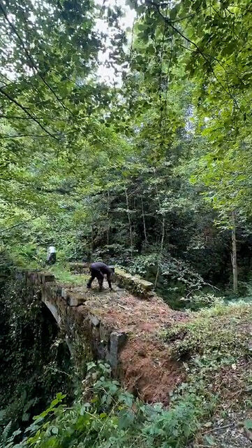 Hemşin‘de ressam Serdar Abay ve ortaokul öğrencisi kızı Behice Betül Abay, tatile geldikleri köylerinde ırmak üzerinde yaklaşık 150 yıl önce inşa edilip, yıllar içinde otlar, çimler ve sarmaşıklarla kaplanan taş kemer köprüde temizlik yaptı.